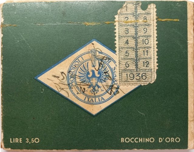 scatolina da 10 sigarette, 1932-38scatolina da 20 sigarette, 1932-38scatola di metallo da 50 sigarette, 1932-38scatolina da 10 sigarette, 1941scatolina da 20 sigarette, 1941scatola di cartone da 50 sigarette, 1941scatola metallica da 50 sigarette, 1941astuccio da 10 sigarette, 1942