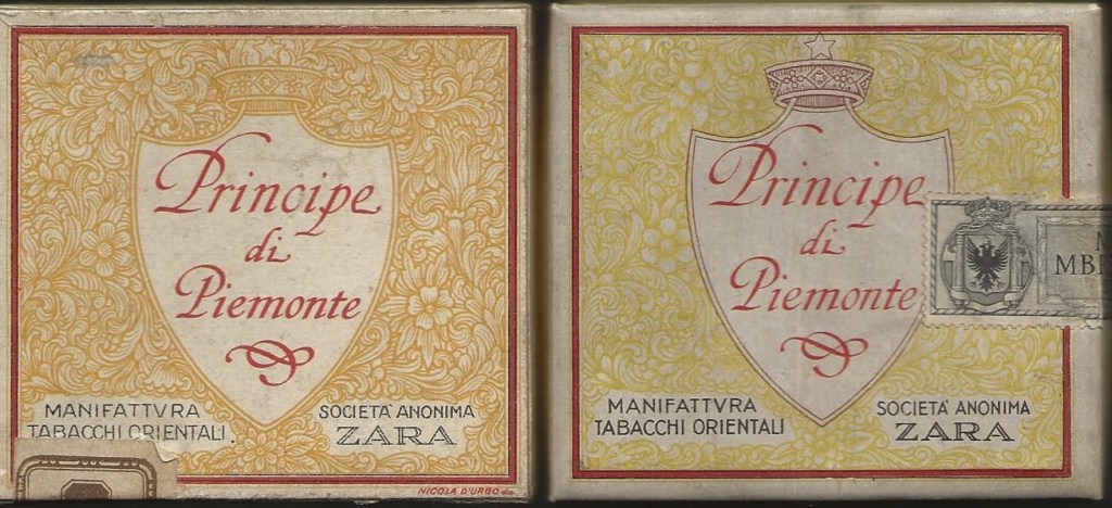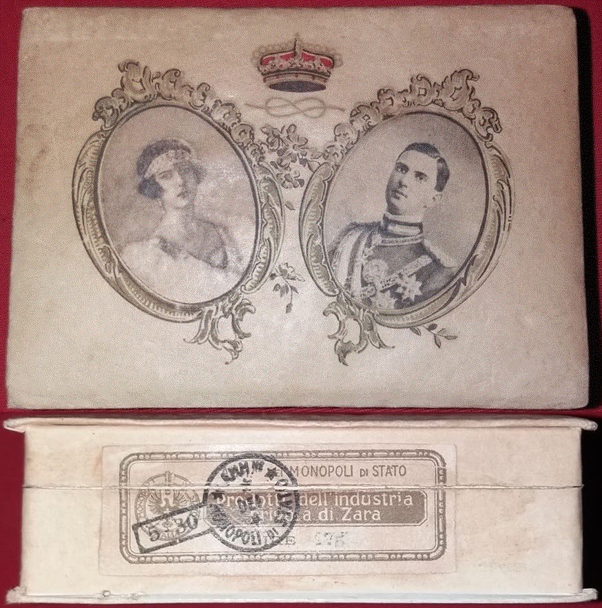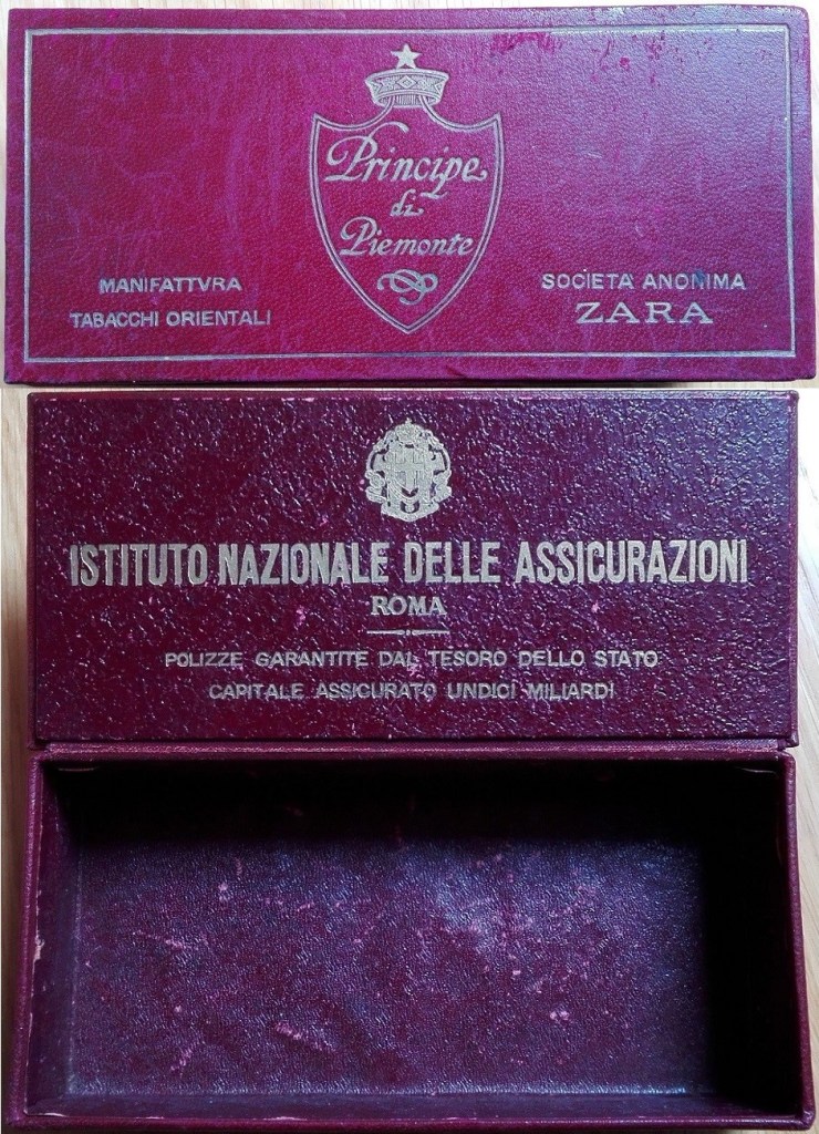 scatolina da 20 sigarette confezione speciale da 100 sigarette prodotta per l’ Istituto Nazionale delle Assicurazioni di Romaconfezione speciale da 50 sigarette prodotta in occasione delle nozze del principe Umberto II con la principessa Maria Jose, 1930
